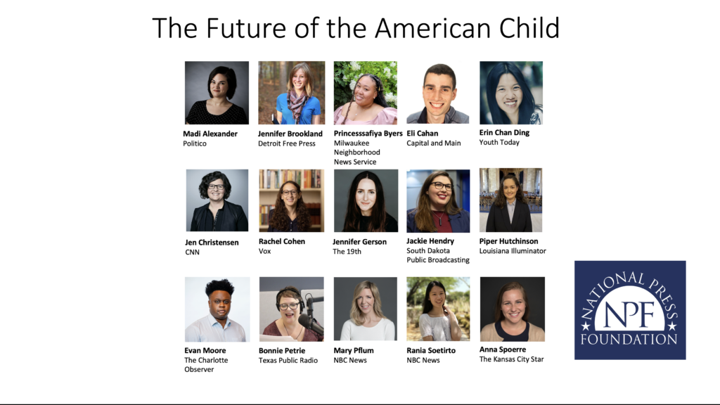 The National Press Foundation is pleased to welcome 15 journalists from across the country to its second Future of the American Child Fellowship. The fellows were selected from newsrooms large and small for their level of interest in children’s issues and their proposals for future coverage.