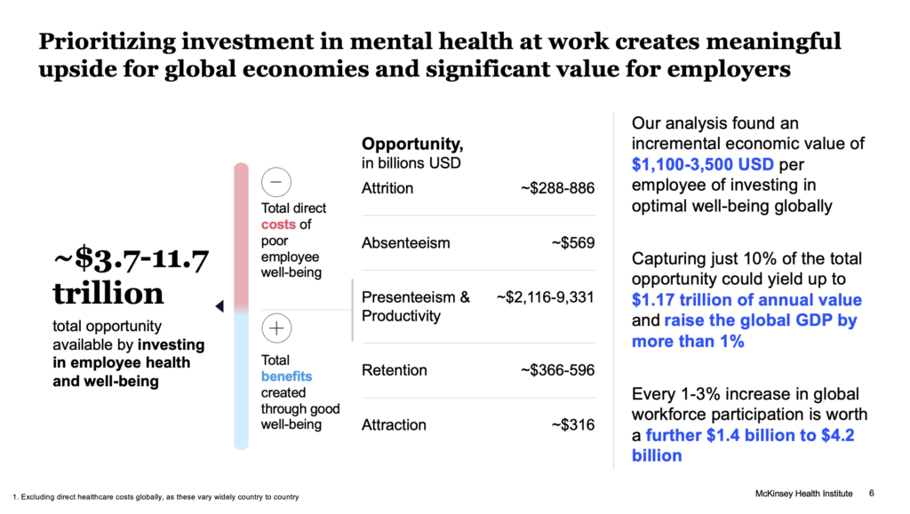 There’s an estimated $3.7 trillion to $11.7 trillion of value that can be gained by investing in employee health and well-being, said Kana Enomoto, partner and director of brain health at the McKinsey Health Institute.