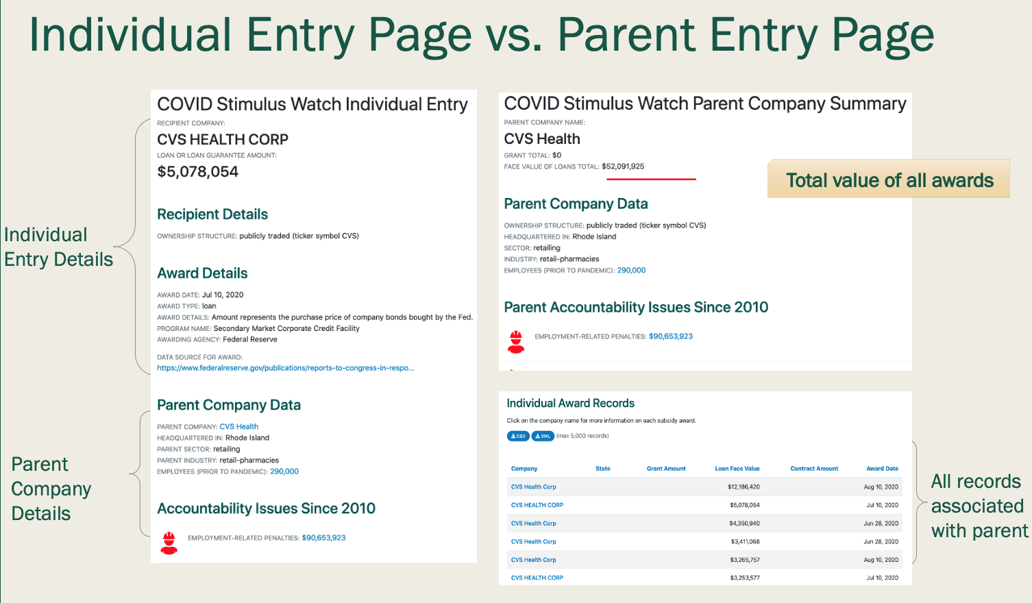 ➂ Journalists can cross-check companies that received loans with those cited for violations. Good Jobs First maintains a “Violations Tracker” that compiles information on corporate crime and misconduct going back to 2000. It includes 480,000 violations logged by 300 federal and state regulatory agencies and these data are updated quarterly. Companies that were either found guilty of labor, environmental or other offenses or that were fined $5,000 or more are listed, and the database links 3,300 of these with their parent companies. An example: Sky Chefs, an airline catering company that shows up in the Good Jobs First data as part of parent company Lufthansa, has been cited for 31 infractions related to safety, consumer protection, environmental or competition-related offenses. “What we do is go through these entries and make all of those relationships, make all of those connections so you get a broader picture, a fuller accounting of each company’s track record,” Good Jobs First research analyst Mellissa Chang said. Data are displayed by individual company and by parent company, as this example of CVS Health Corp. shows.