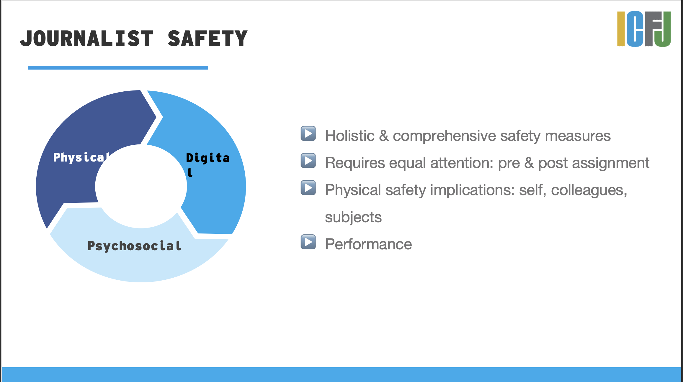 • Peer support through the ICFJ Pamela Howard Forum on Global Crisis Reporting discussion groups. “Colleague-to-colleague communication has shown that it really provides a sense of validation, and just talking to people who understand the context and the content of the work is something you can’t get elsewhere.”